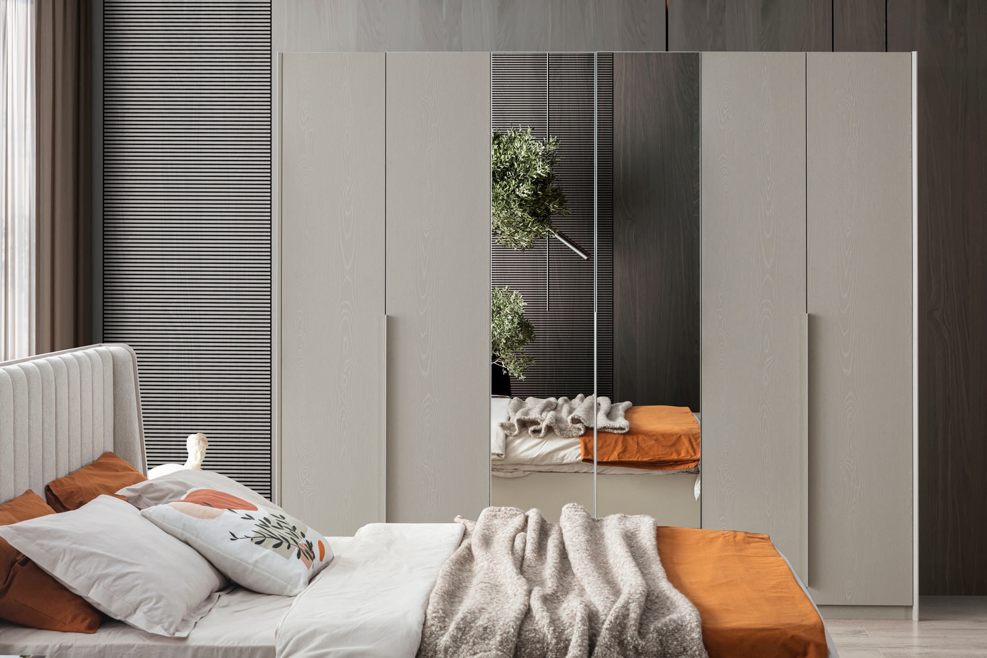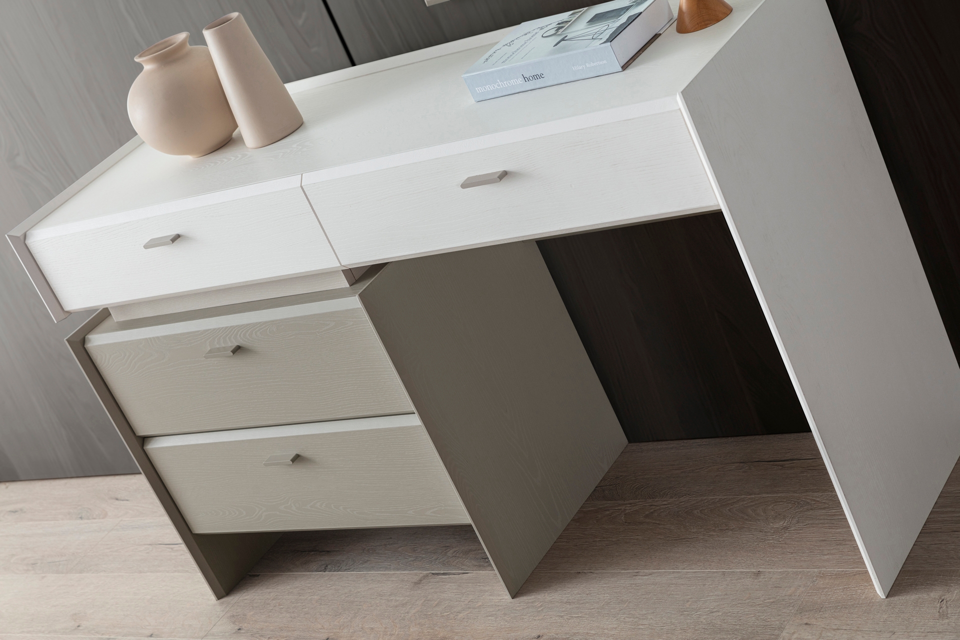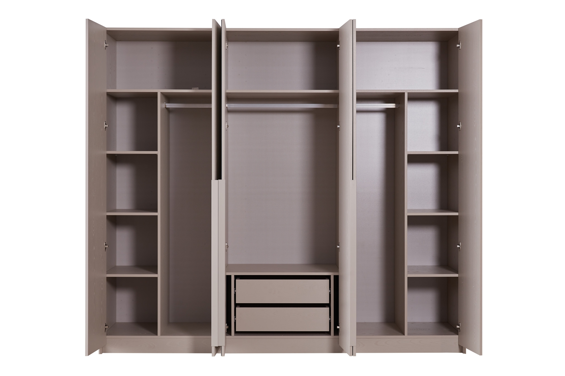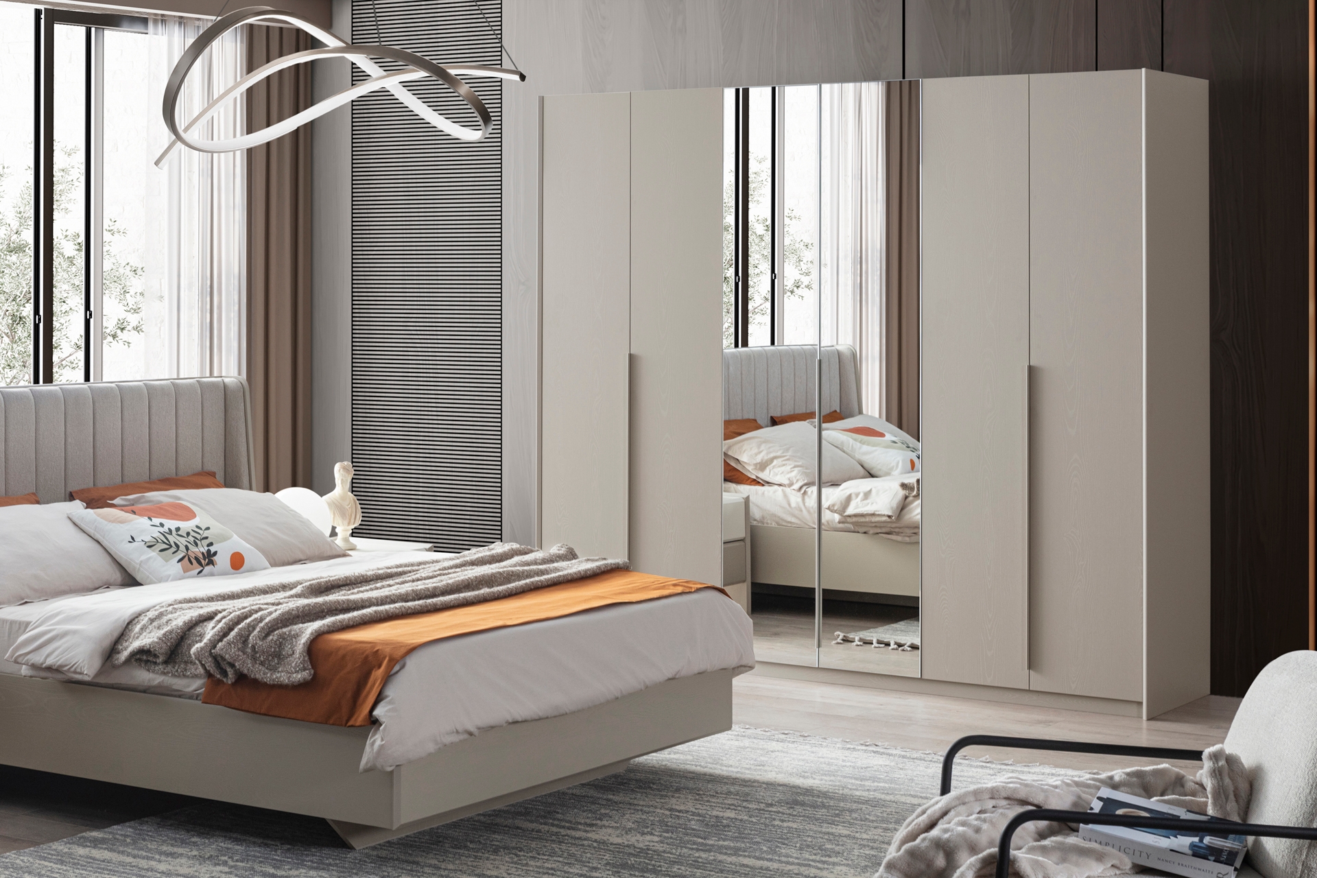 Gardırop: Menteşe kapaklı, geniş iç hacimli ve ihtiyaca göre ek çekmece modülü eklenebilir yapıdadır.