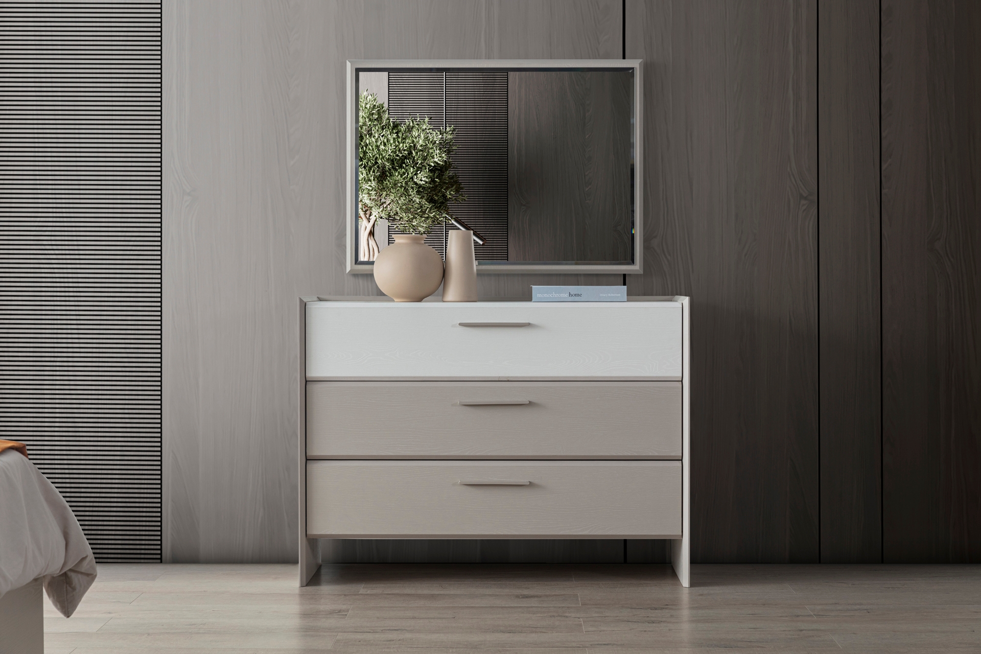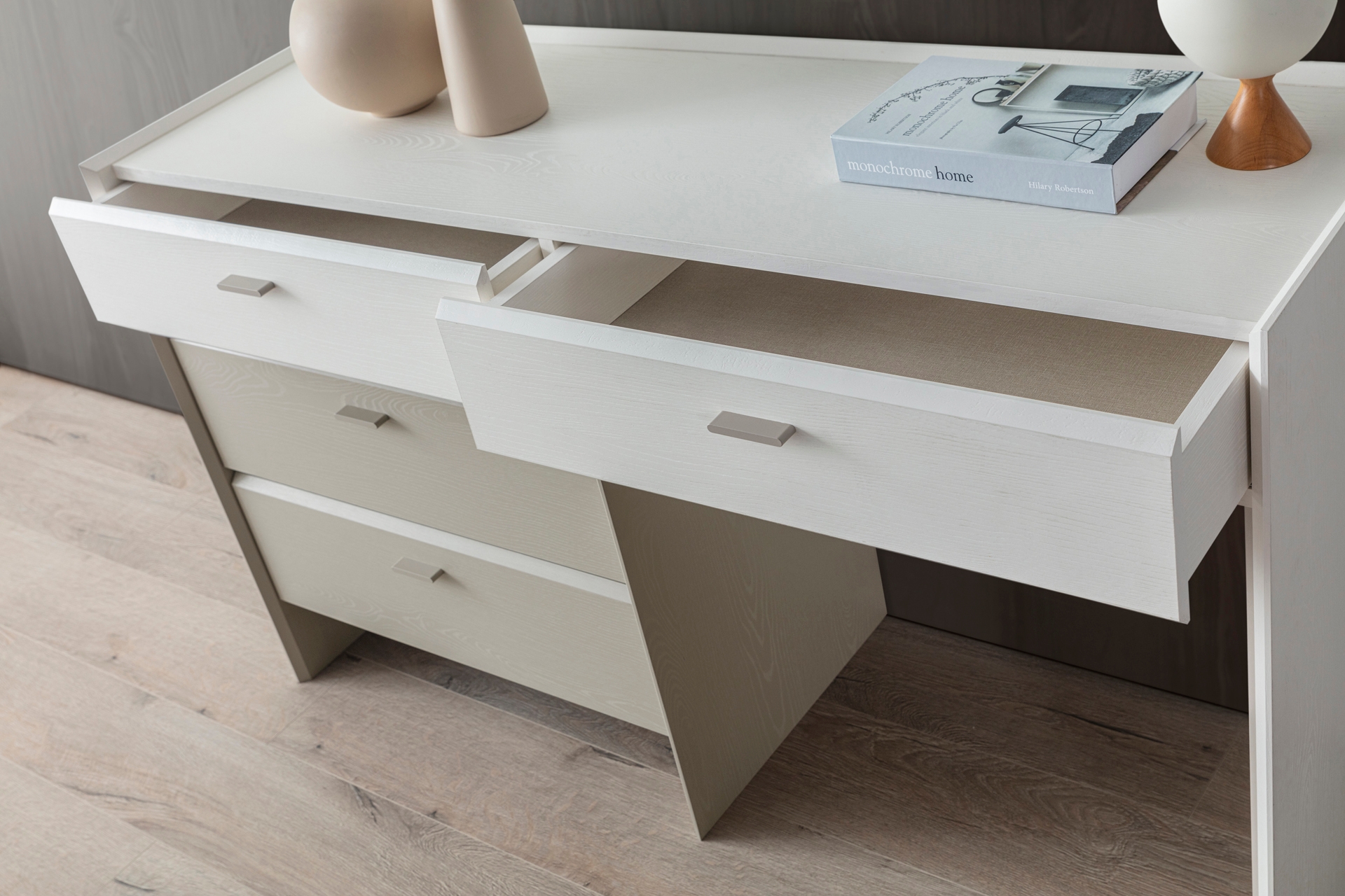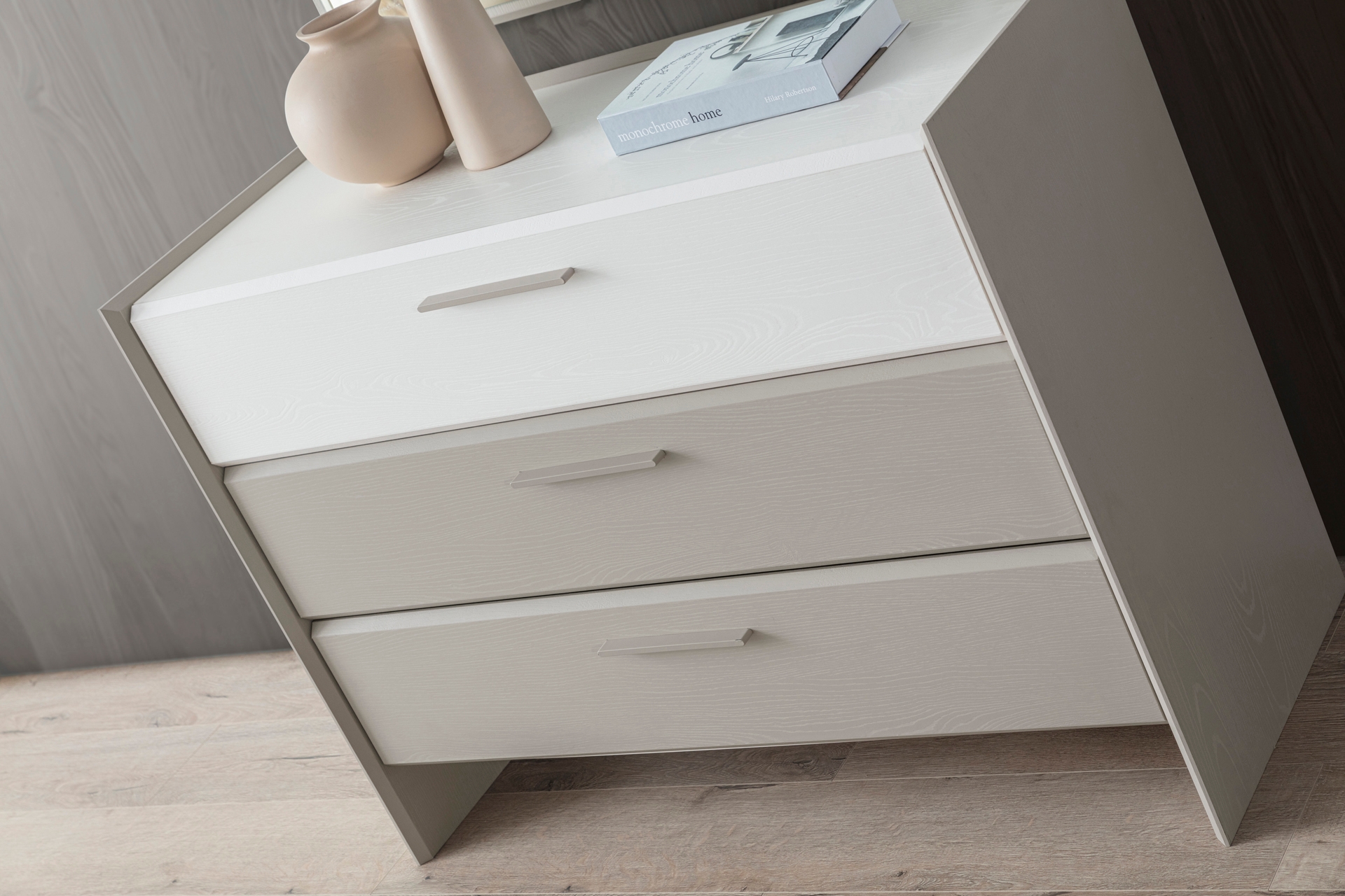 Gardırop: Menteşe kapaklı, geniş iç hacimli ve ihtiyaca göre ek çekmece modülü eklenebilir yapıdadır.