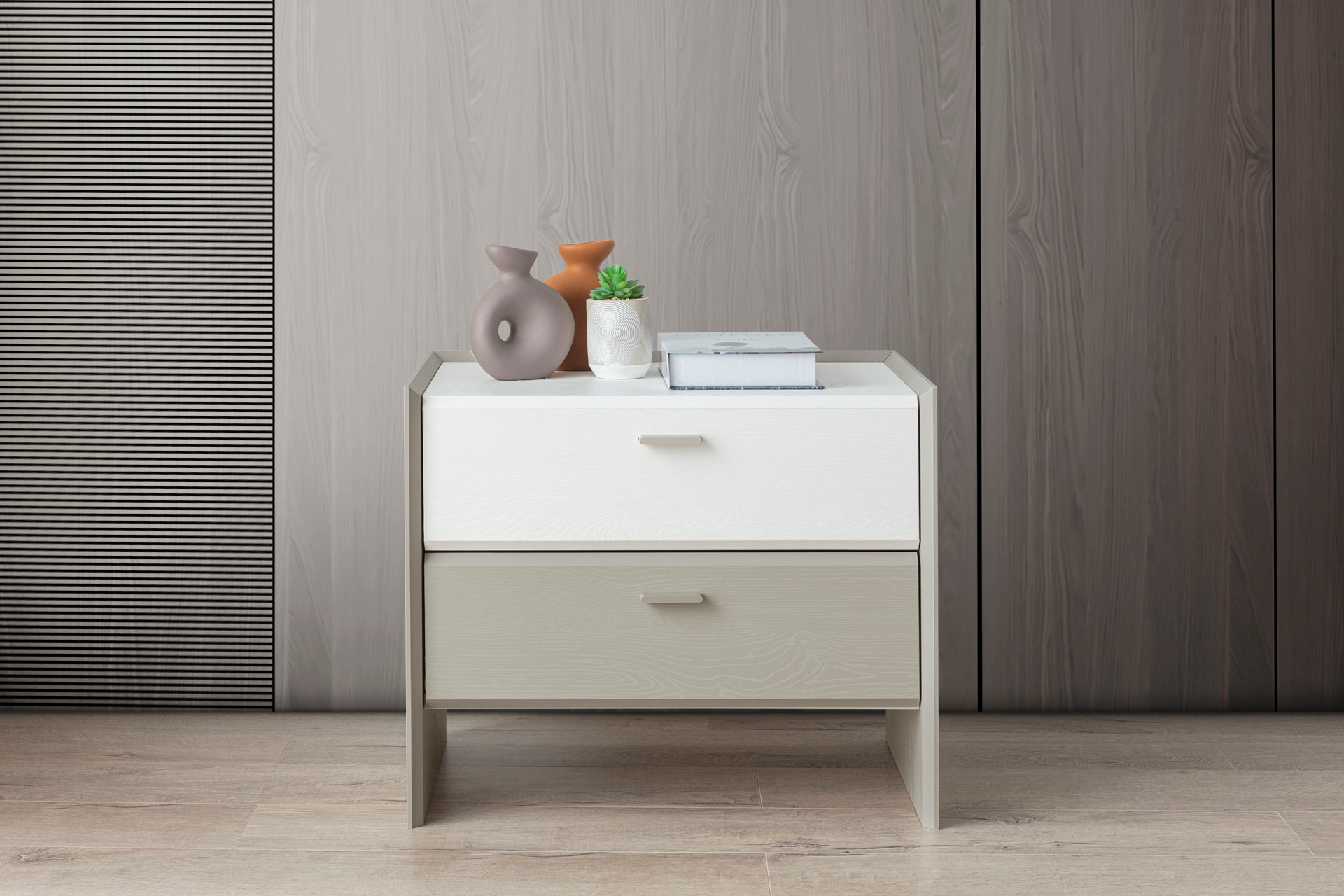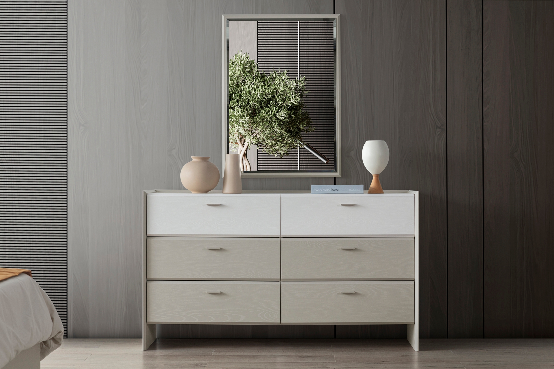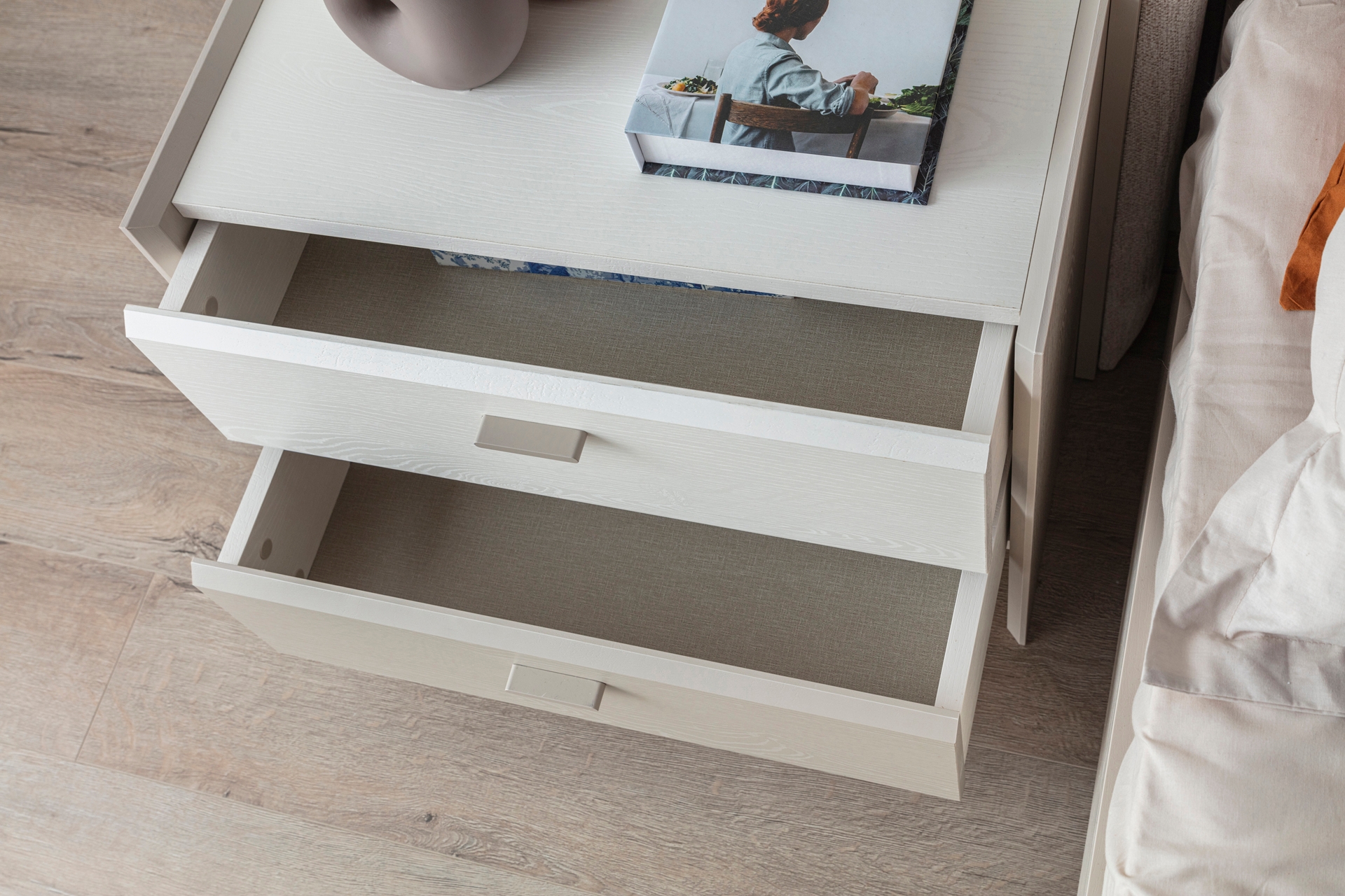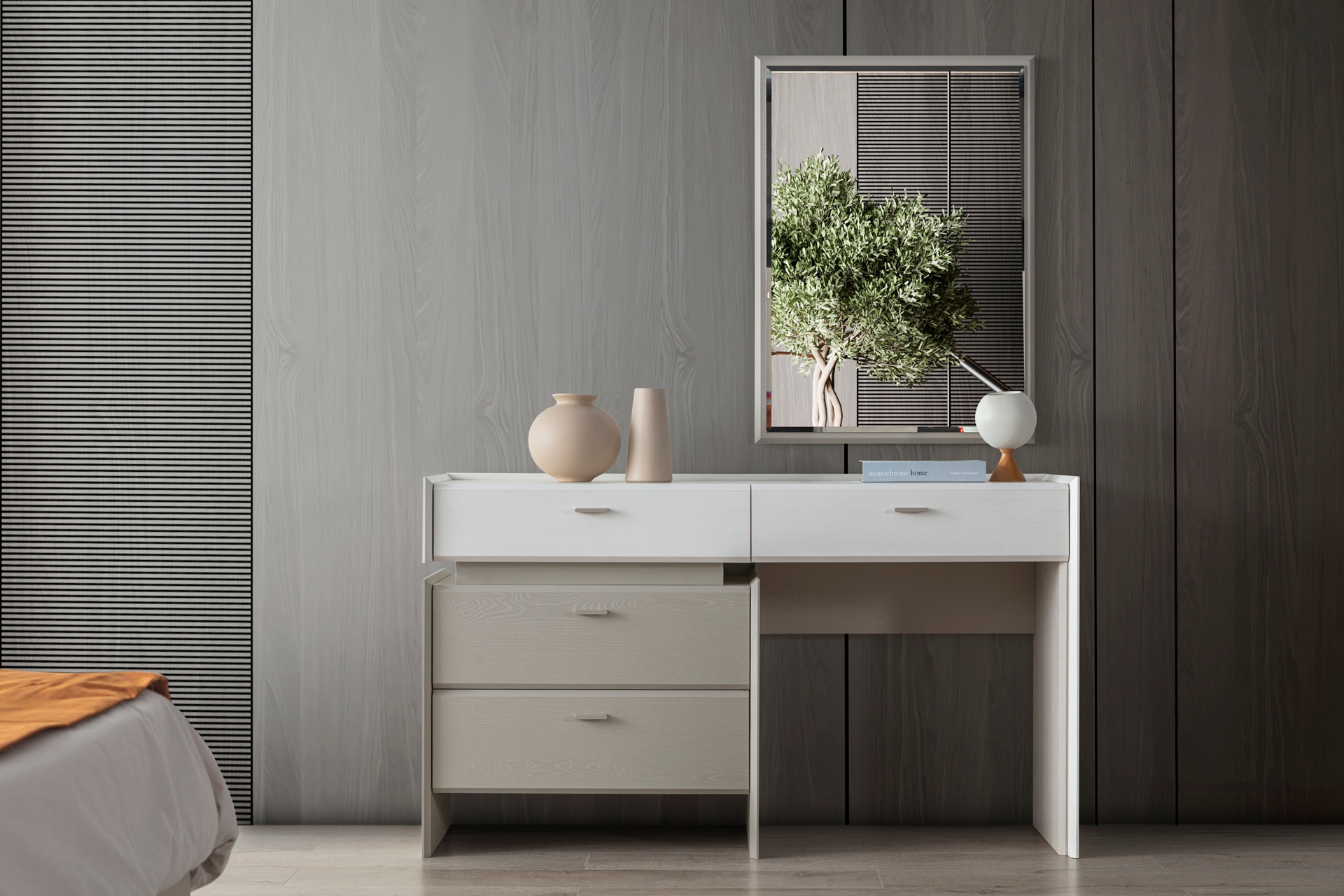 Gardırop: Menteşe kapaklı, geniş iç hacimli ve ihtiyaca göre ek çekmece modülü eklenebilir yapıdadır.