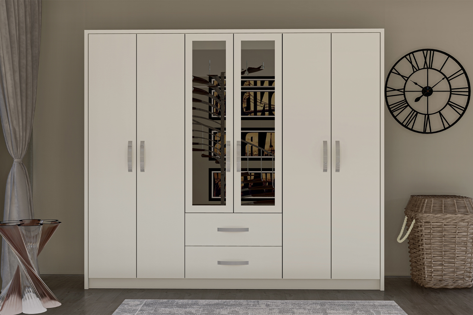 Gardırop: Menteşeli kapak sistemi; orta kapakta yer alan ayna detayı günlük kullanımda kolaylık sağlar.