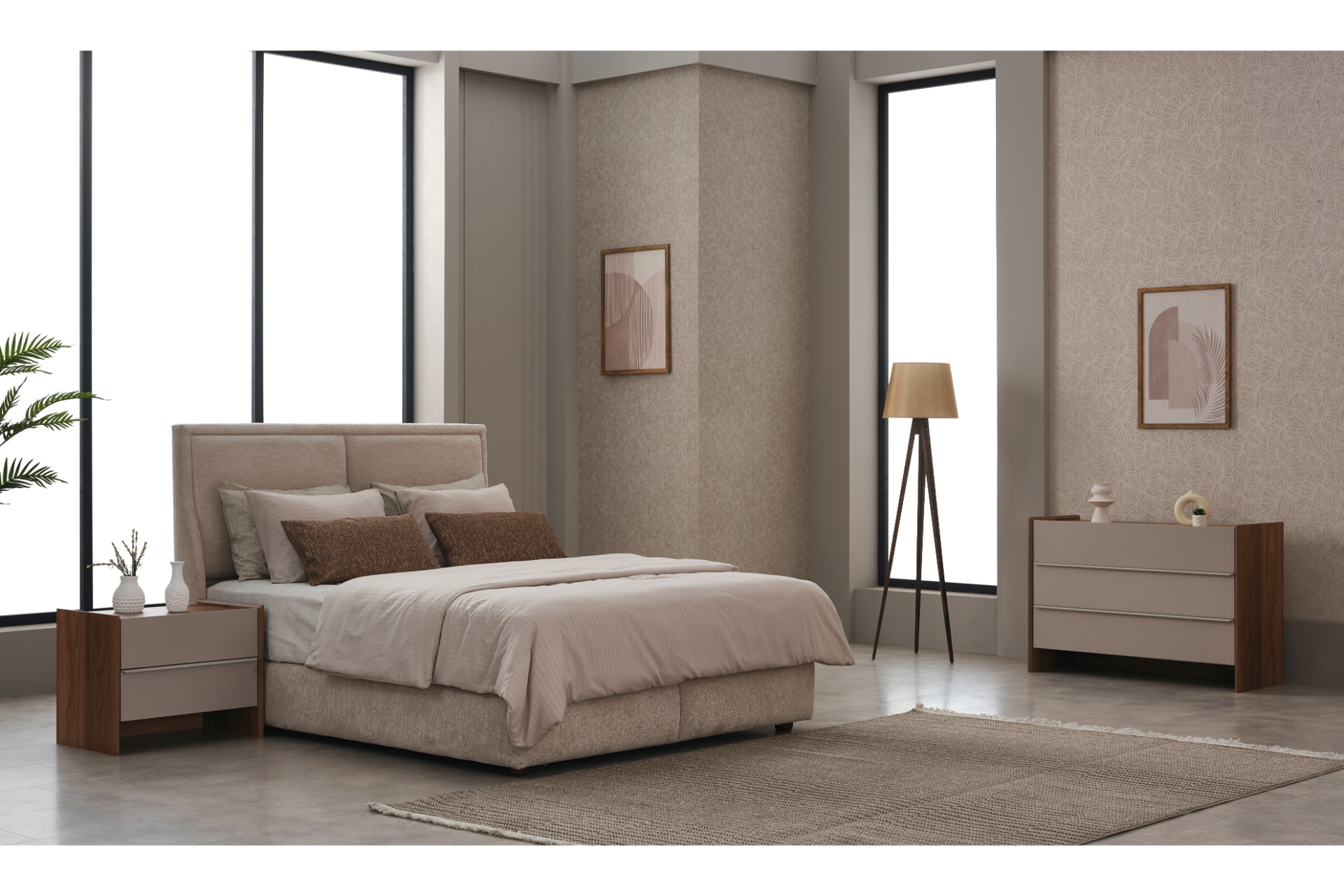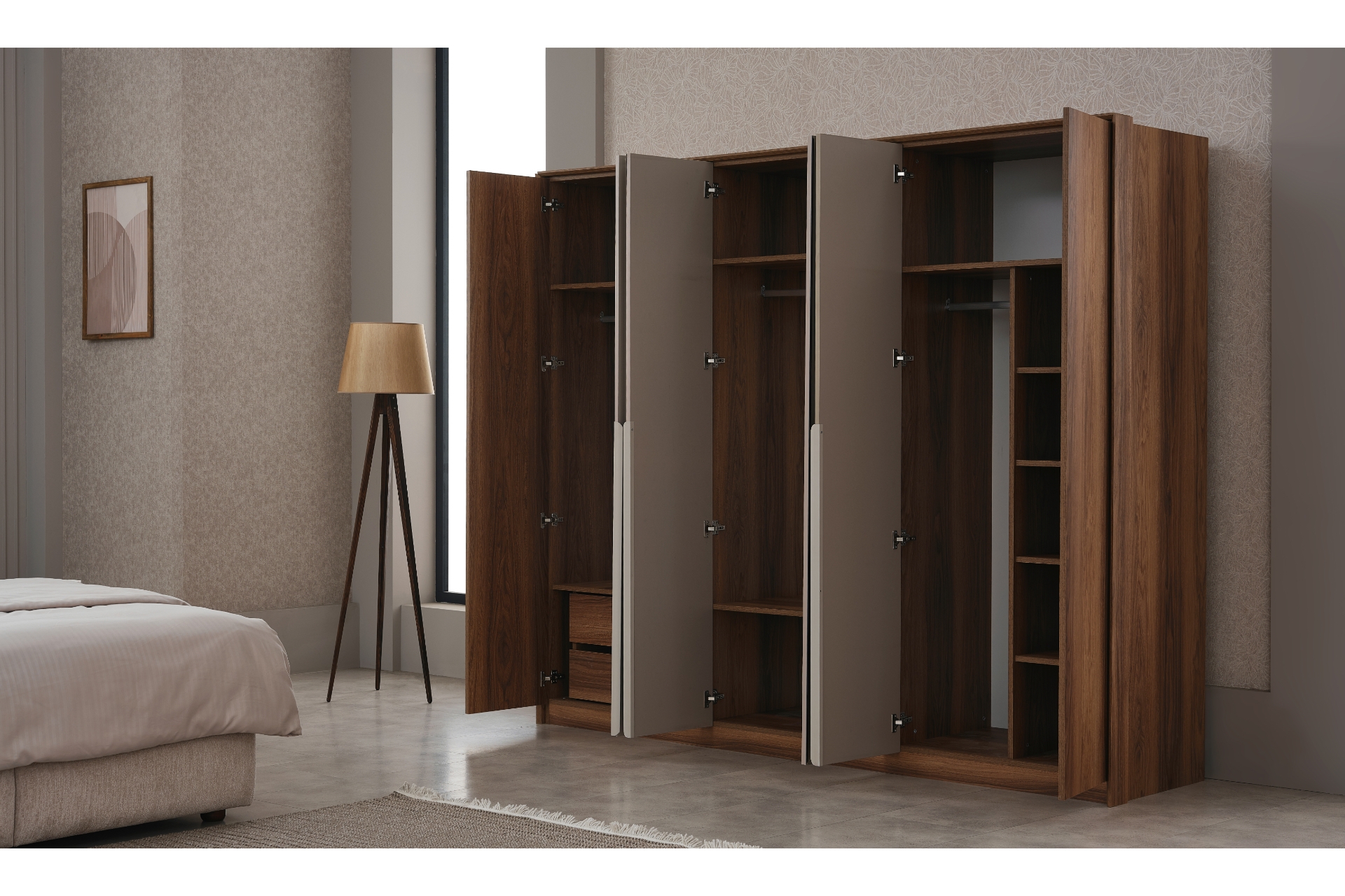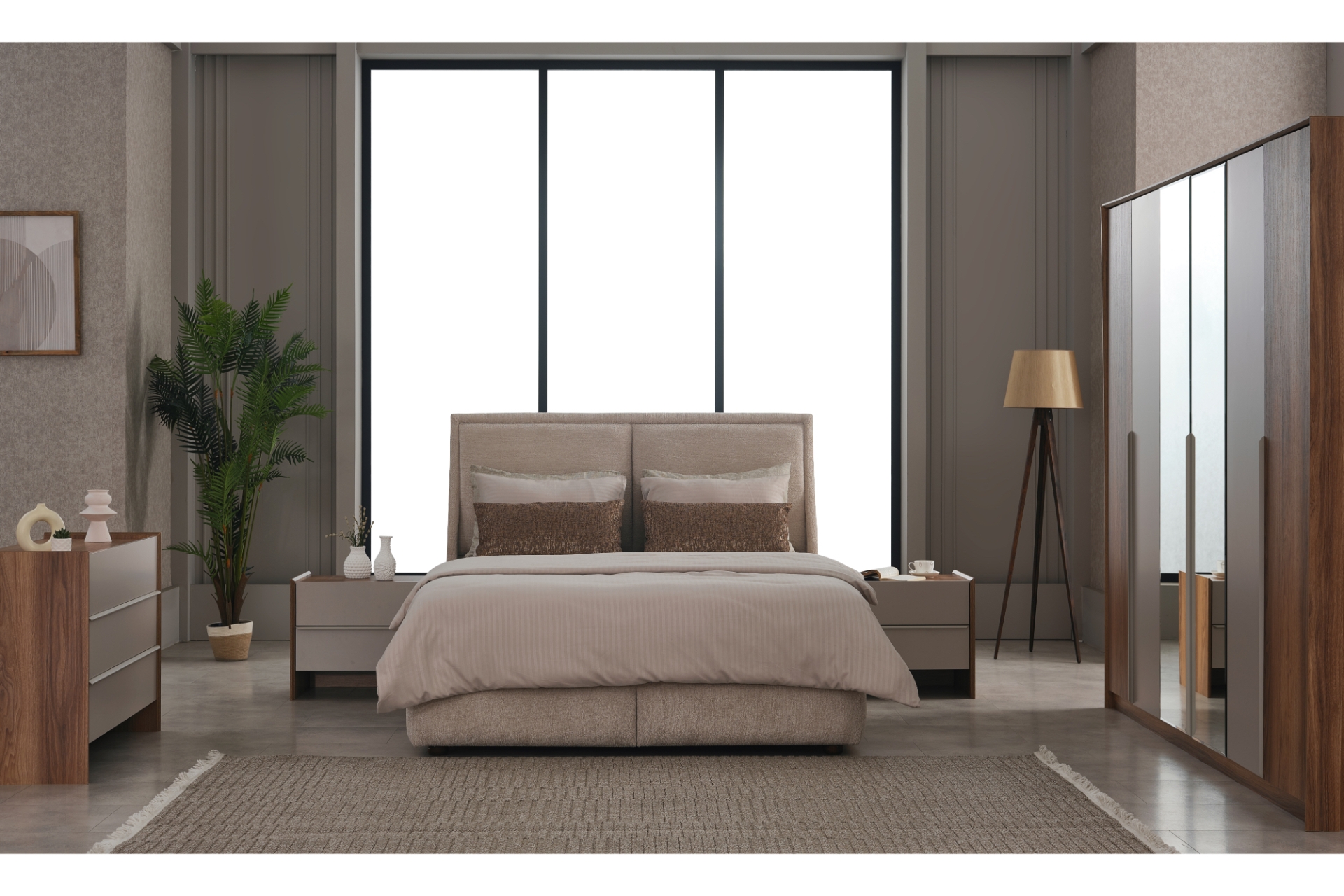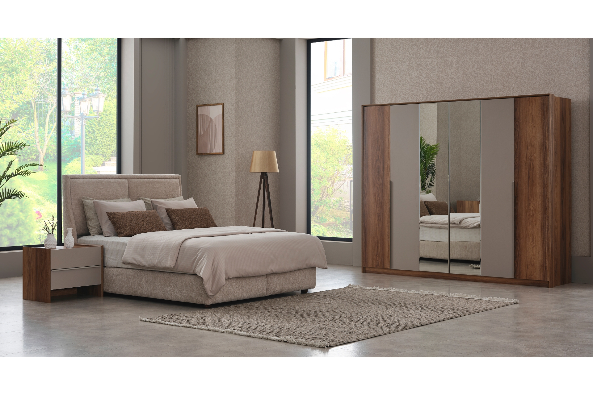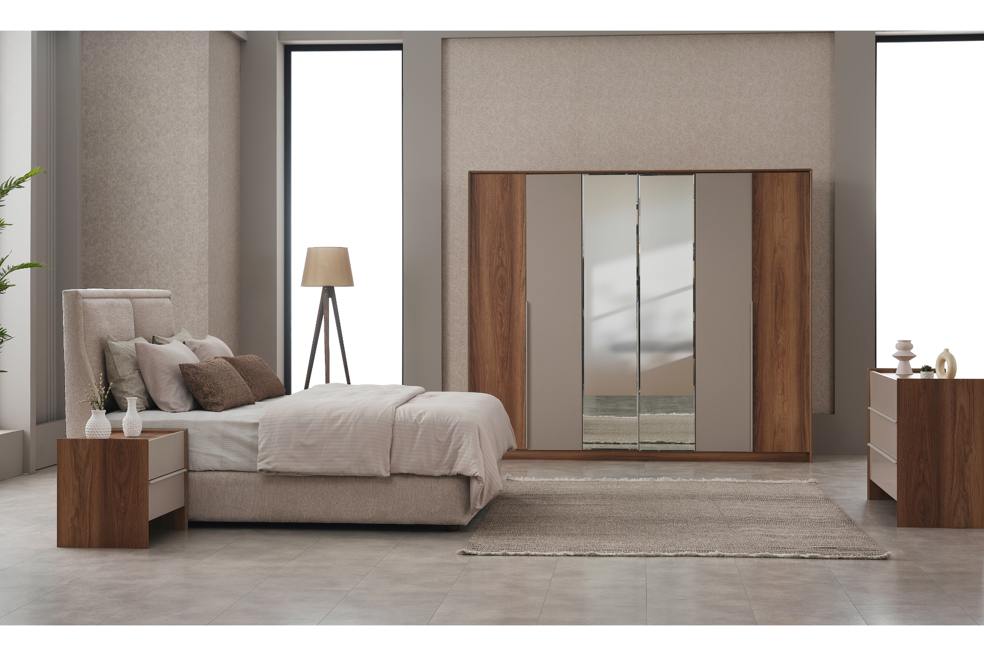 Tasarım: 6 kapaklı gardırop üzerinde yer alan geniş aynalar odaya derinlik ve ferahlık katar.