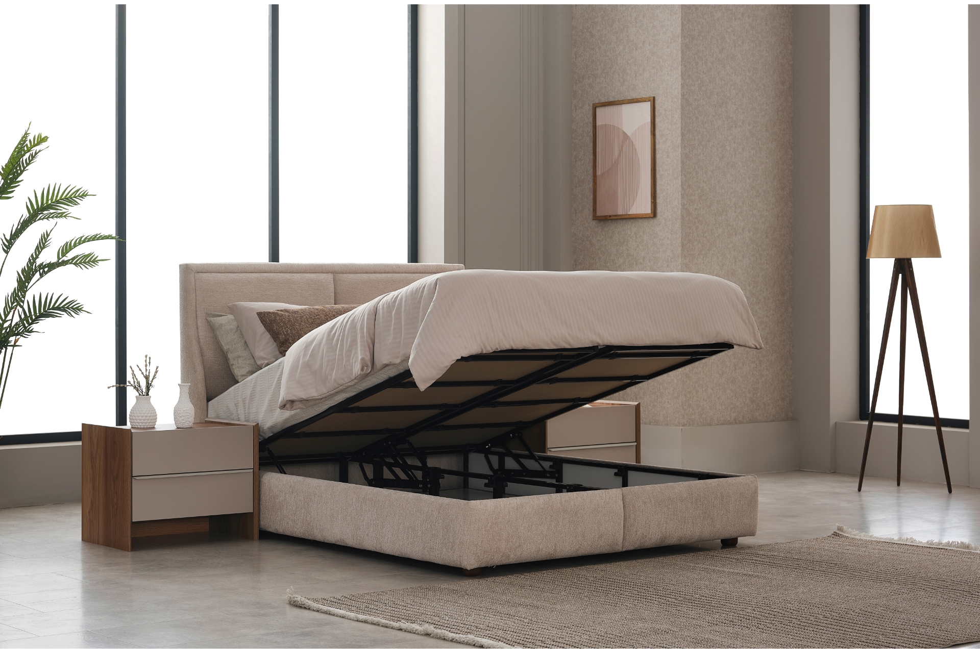 Baza Fonksiyonu: 4 adet mukavemetli amortisör ve 2 adet emniyet kilidi (stoplama sistemi) ile güvenli ve geniş bir depolama alanı sağlar.